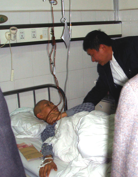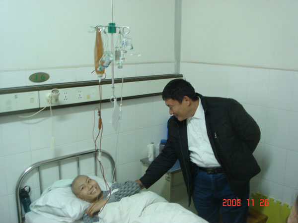 劉小龍,一個20歲的年輕小伙子,曾經(jīng)在公司車間工作。一個風(fēng)華正茂的年齡一個正是爭取自由的年齡,一個積極上進勤奮好學(xué)的小伙子,不幸卻在今年八月中旬被檢查出得了白血病。多么令人可怕的字眼,多么令人討厭的病痛,但不幸確確實實在我們身邊發(fā)生了。病痛一天天在折磨他、在打擊他,拍片、輸血、輸液、化療......,父母的勞累自不必說,巨額醫(yī)療費用也讓這個家庭難以承擔(dān)。24日晚全豐公司董事長王志國及工會主席陳志靜攜公司其他成員一行六人專程去醫(yī)院探望了劉小龍及其家人,這些情況全豐公司的領(lǐng)導(dǎo)看在眼里急在心里,看到自己的兄弟在忍受痛苦,領(lǐng)導(dǎo)們的心情非常沉重。