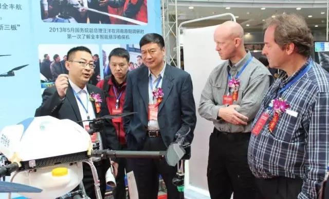 蘭玉斌教授帶著美國(guó)農(nóng)業(yè)部農(nóng)業(yè)科學(xué)研究署B(yǎng)radley K Fritz 高 級(jí)研究員和昆士蘭大學(xué)施藥與安全中心Andrew Hewitt 教授/主任 等一行學(xué)者前往安陽全豐航空展位參觀,并向兩位外賓介紹全豐,周總為參觀學(xué)者介紹全豐油機(jī)電機(jī)。