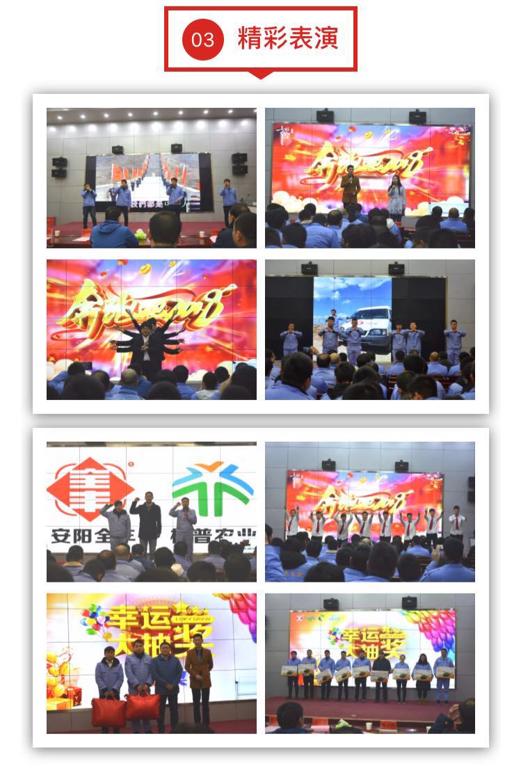 隆重的總結(jié)表彰活動結(jié)束后,以“奔跑吧2018”為主題的聯(lián)歡會拉開序幕。原藥分公司的一曲《我是中國人》唱出了全豐人的豪邁,太行培訓學校表演的舞蹈《舞動青春》和制劑分公司表演的《新春舞會》有異曲同工之妙,博得現(xiàn)場陣陣掌聲,標普公司表演的小品《我是飛行員》把一個失戀青年加入飛防隊伍后的徹底蛻變刻畫得惟妙惟肖。飛防隊的小伙子們也帶來驚喜,太極拳表演柔中帶剛、虎虎生威,生產(chǎn)技術(shù)部的男女聲獨唱和財務(wù)部的二胡表演各具特色,活動現(xiàn)場的幸運抽獎環(huán)節(jié)更是讓現(xiàn)場歡呼聲和掌聲此起彼伏。歡笑聲中,全豐人告別了2017年,2018年我們攜手并進,再創(chuàng)輝煌!全豐人贏戰(zhàn)2018!加油干!
