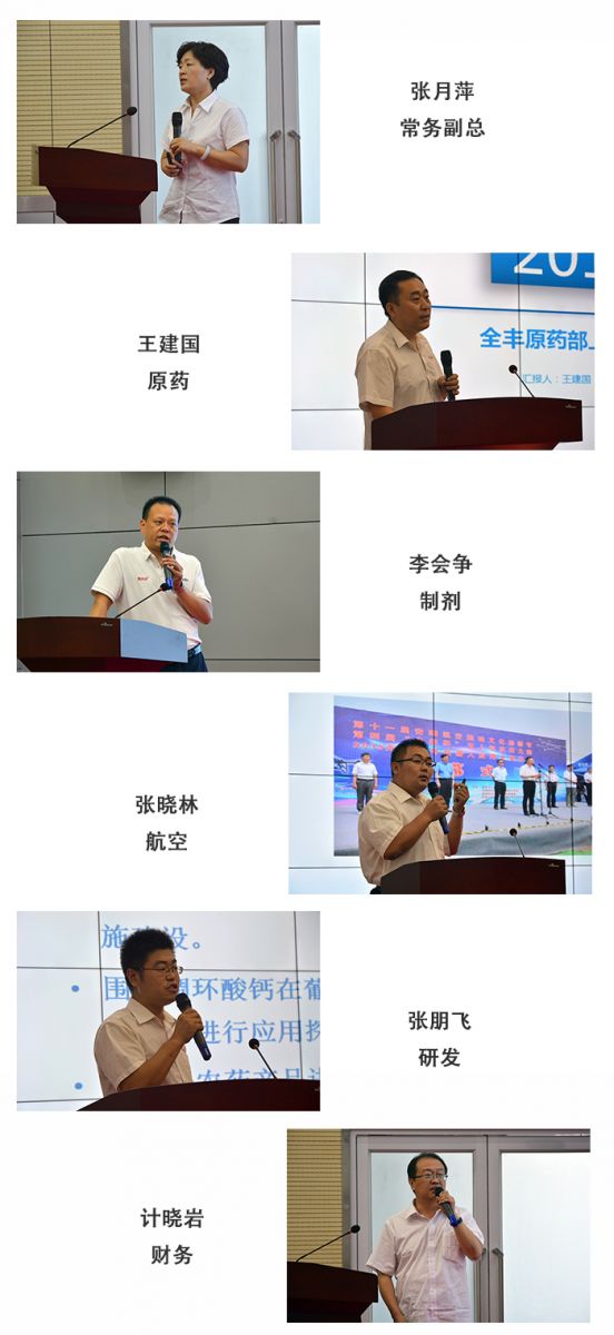 在述職環(huán)節(jié),原藥、制劑、航空、研發(fā)、財務、綜合等各分公司和部門第 一責任人依次進行述職報告。原藥、制劑、航空還針對各自部門的銷售業(yè)務取得成績和團隊建設等方面詳細進行分析。